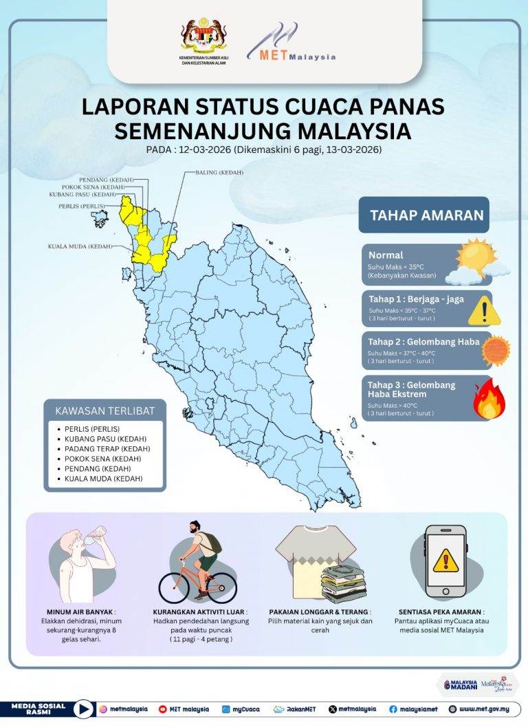 根据大马气象局(Malaysian Meteorological Department)于今天(3 月 13 日)发布的天气警报显示,北马 6 地区将面临高温预警,气温料介于 35℃至 37℃之间:
