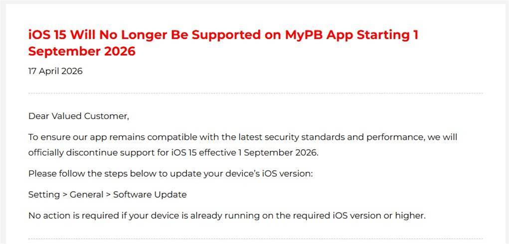 根据大众银行(Public Bank)官网发出最新消息显示,从 2026 年 9 月 1 日起,MyPB APP 将不再支持在运行 iOS 15 的苹果手机上使用。