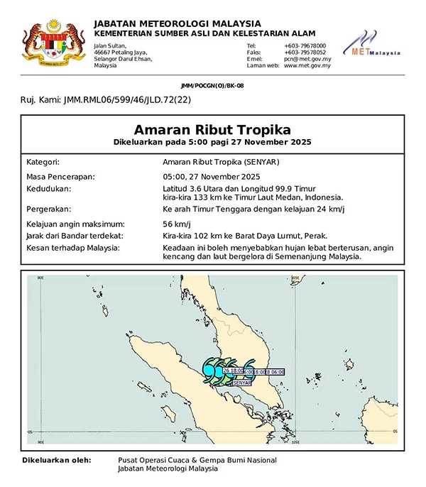 不仅如此,马来西亚气象局已经就“Senyar”热带风暴的通造,从“提示”(Nasihat),升级为”警告”(Amaran)。