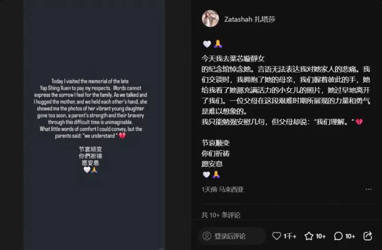公主东姑扎塔莎发文分享前往灵堂悼念叶芯嫙的心情,并表示无法用言语表达其中的悲痛。