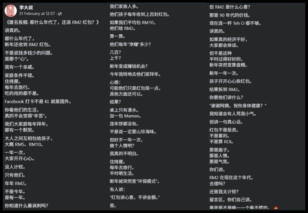 最近,有网民在《李大叔》面子书专页上匿名投稿表示,自己的孩子每年都收到某位亲戚给的RM2红包,让他直呼:“都什么年代了!”