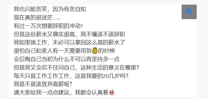 “我又会忍不住问自己,这种生活的意义在哪里?我是不是该放弃高薪?”