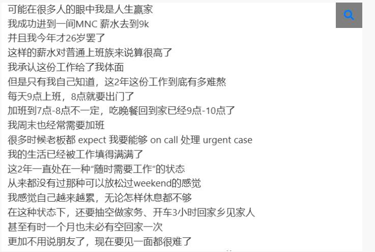 这份工作给了他体面,但只有他知道,这份工作有多煎熬!一名大马打工仔日前通过匿名平台发文,表示今年26岁的他可能在很多人的眼中是人生赢家,但只有他自己知道,这份工作的煎熬。他在文中表示,自己每天9点上班,加班到7-8点,且周末也经常需要加班,让他忍不住直言“生活已经被工作填满”。