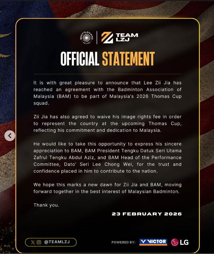 李梓嘉团队通过IG宣布:“我们非常高兴地宣布,李梓嘉已经与大马羽总达成协议,成为大马2026年汤姆斯杯代表队的成员之一。”