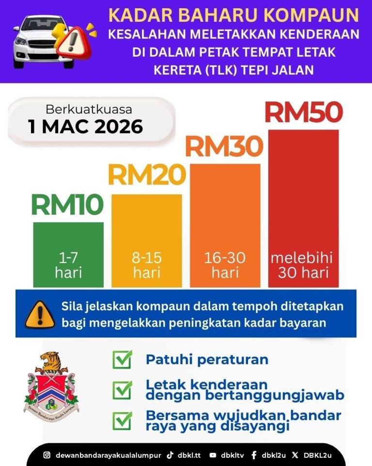 根据吉隆坡市政厅(DBKL)在官方 Facebook 发布的公告,自 2026 年 3 月 1 日起,对于车辆停放在路边停车格内的违规行为,将实施新的罚款标准。