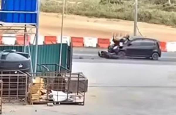 视频显示,2名窃贼随即奔向出口处准备逃离现场,未料被闪避不及的第二国产Viva轿车撞飞,店员想要抓住他们,2名窃贼将对方推开后,立即向草丛深处跑去,消失踪影。