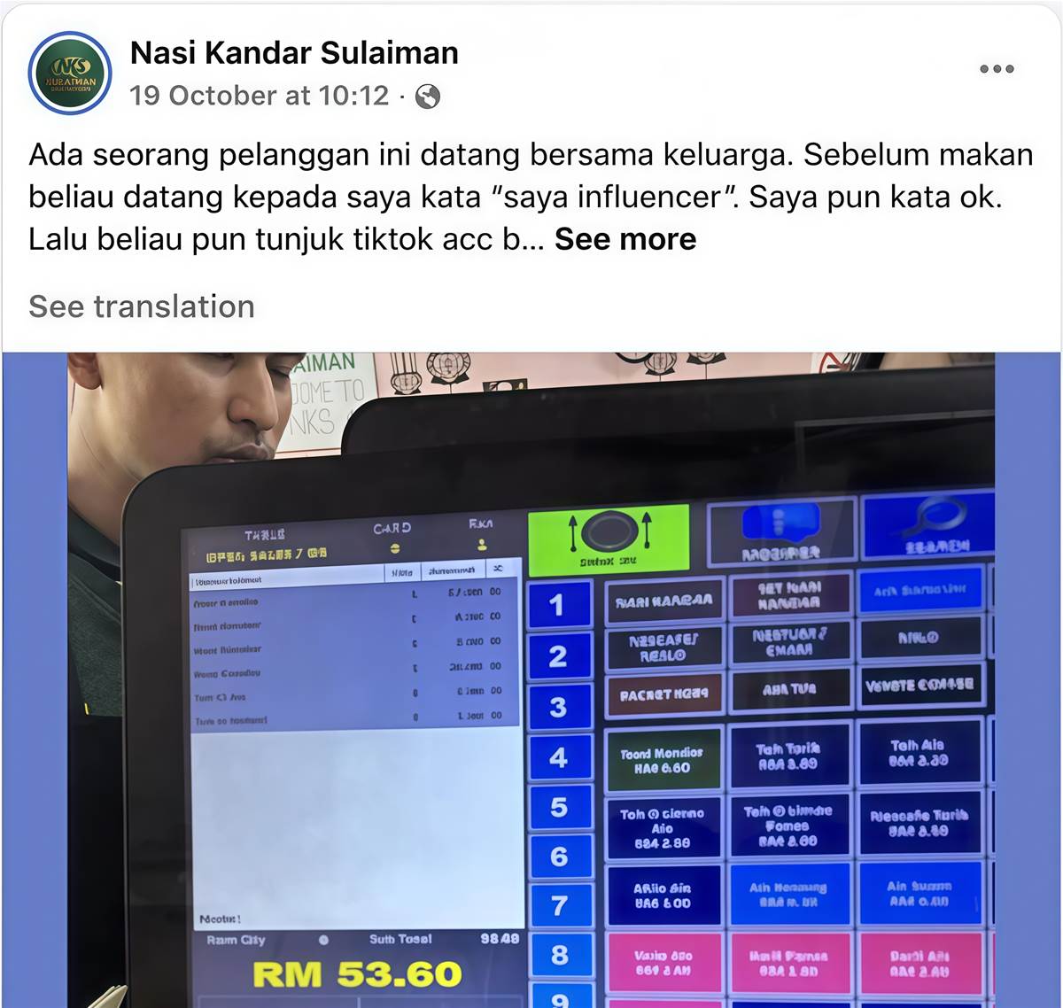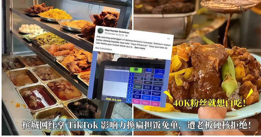 近日,一名自称拥有 40K TikTok 粉丝的网红在槟城乔治市一家著名的扁担饭(Nasi Kandar)餐馆用餐时,以「我是网红」为由,要求店家老板免费招待他一家人,但遭到拒绝,引发网民热议。