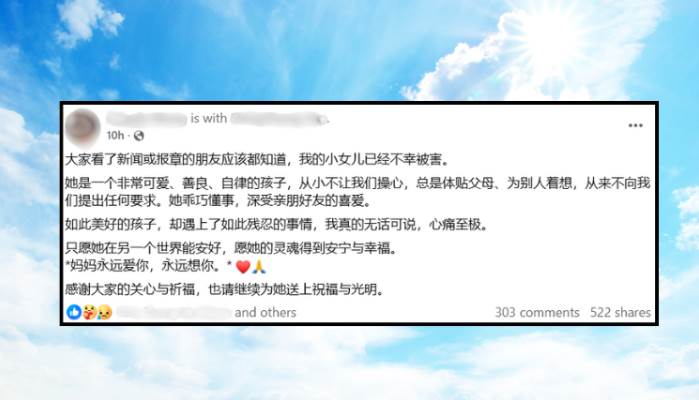 女儿乖巧、自律、善良根据《中国报》报导,叶妈妈早上在Facebook发贴文悲痛证实,小女儿不幸遇害,并祈愿对方在另一个世界得以安好,灵魂安宁而幸福。她写道,女儿是个乖巧、自律又善良的孩子,从小不让家人操心,总是体贴父母、为他人着想,从未对家人提出过任何要求,深受亲友喜爱。“如此美好的孩子,却遭遇如此残忍的事情,我真的无话可说,心痛到极点。
