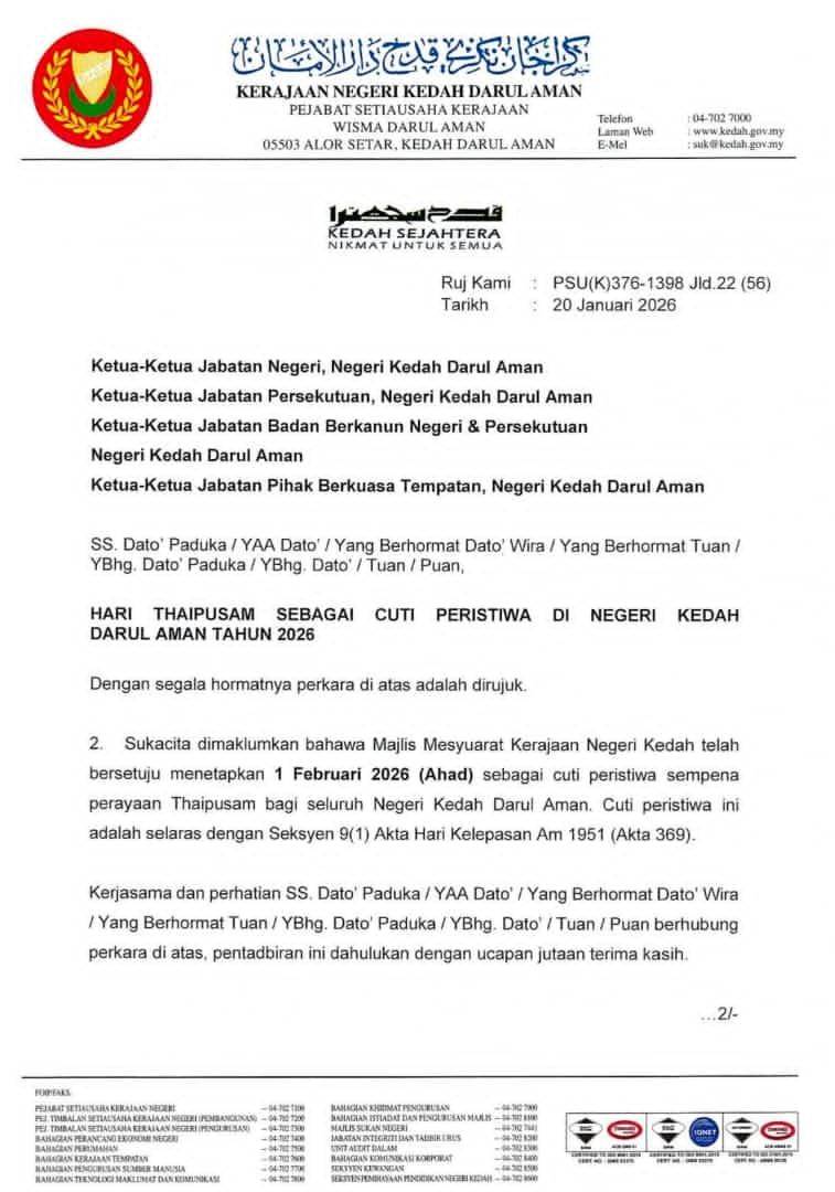 1月20日,吉打州副州秘书(管理)拿督纳兹曼发公函给州政府及联邦相关机构。公函指出,州政府依据《1951年假日法令》(第369号法令)第9(1)条文,将大宝森节列为特别假期(CutiPeristiwa)