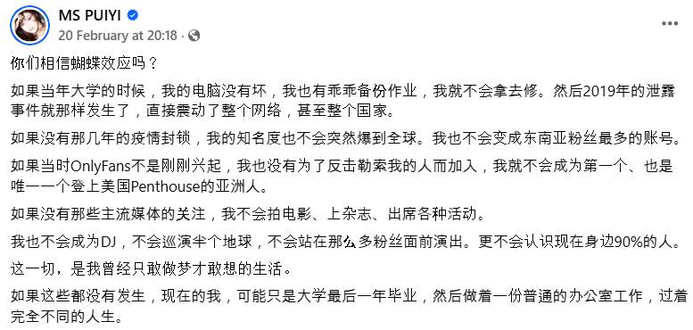 Ms Puiyi在贴文中以“你们相信蝴蝶效应吗?”为开头,表示她当年读大学时如果电脑没有坏,她也有乖乖备份作业,她就不会拿电脑去修,导致2019年的泄漏事件发生。