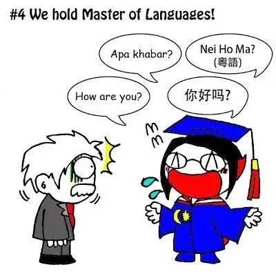 大马人能说多种语言那是全球闻名的事情,当你和外国人相处时,他们都会惊讶于大马人能随时转换英语、华语、马来语,甚至是粤语、闽南语、客家话、海南话、潮州话等的语言能力。多种语言是大马人的特色,也是大马人最大的竞争力!