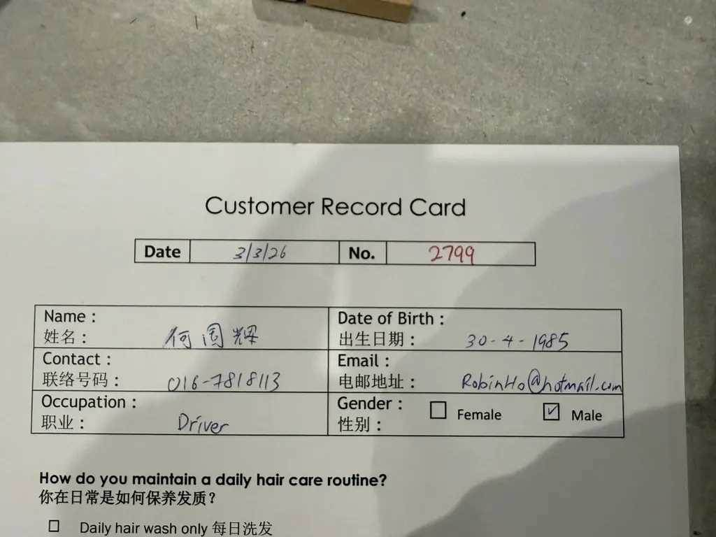 事情发生于 2026 年 3 月 3 日傍晚 6 点 14 分这位自称「何国辉」的大哥,walk-in 进来我店位于 BUKIT JALIL AURORA PLACE 2 楼的发廊当时我同事有空,我就安排了同事为他服务他进来说要剪和染我们家服务流程都会让顾客填写资料,以方便我们可以找回顾客在我们店的消费记录或者顾客不小心遗漏任何东西在我们店的时候,我们可以立即联络顾客。