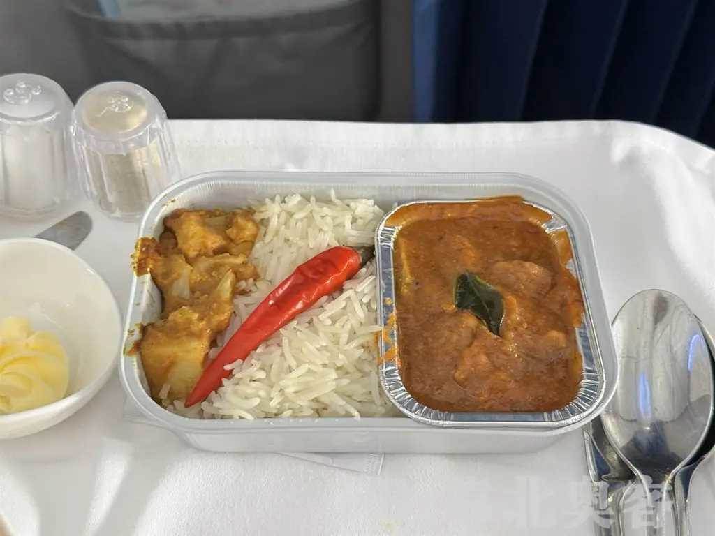 该乘客表示,航班中午起飞,因为早餐刚吃过,原本只打算随便尝一口。他先选择了蓝色蝶豆花饭配咖喱鸡,觉得味道不错。没想到,乘务长逐一询问乘客是否需要加餐,其他人都婉拒,唯独他点头说「可以试试看」,结果就开启了「连环上菜」模式。