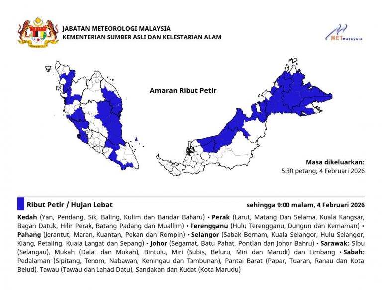 根据大马气象局(Malaysian Meteorological Department)于今天(2 月 4 日)发布的天气警报显示,全马多个州属预计将出现雷雨直至 9PM,受影响地区包括: